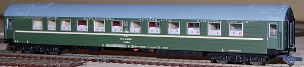 Ukrán "Y" típusú hálókocsi. A Tisza-Expresszben jár(t) ilyen, de ezen Druzsba (Kijev-Berlin) tábla van